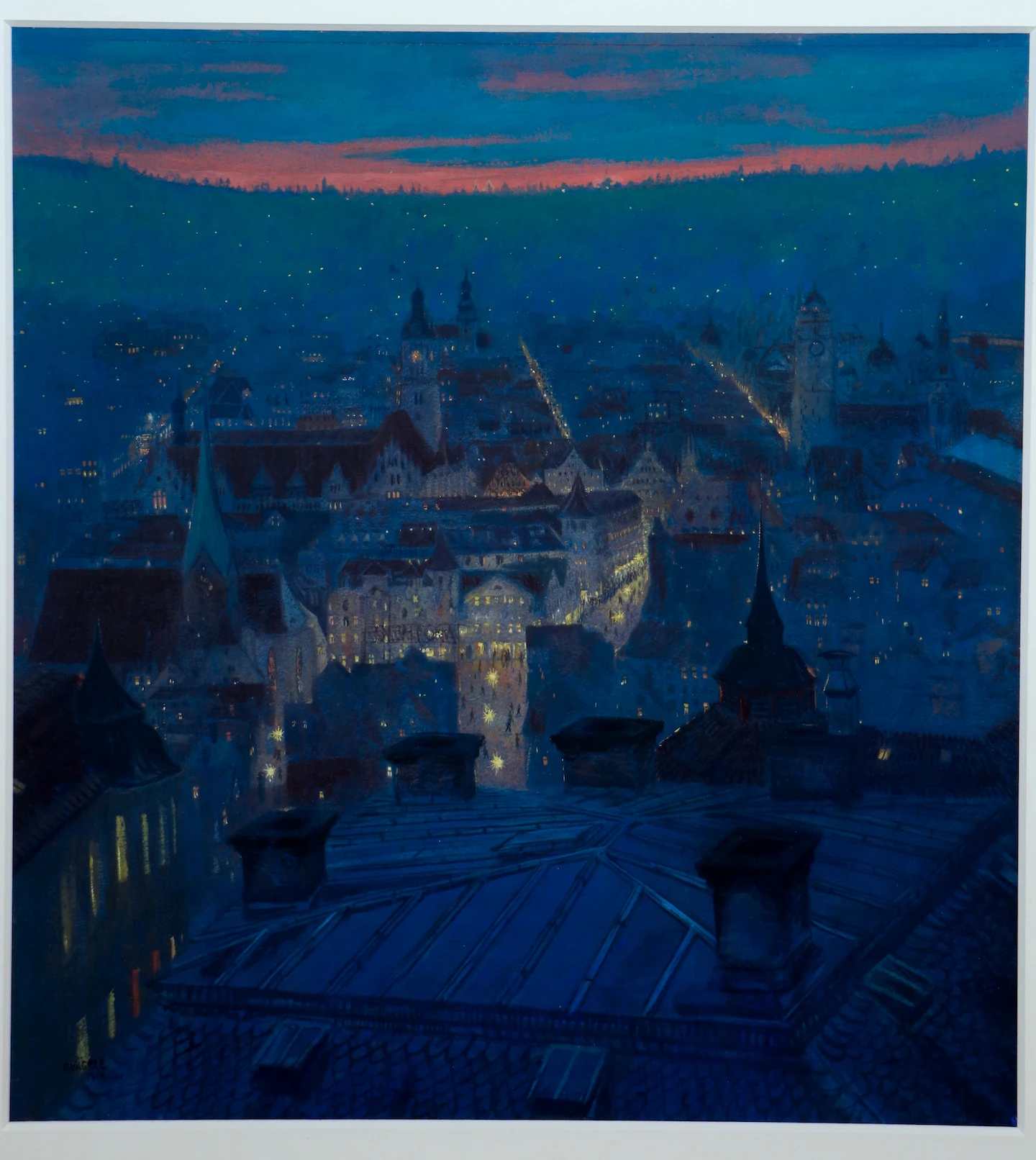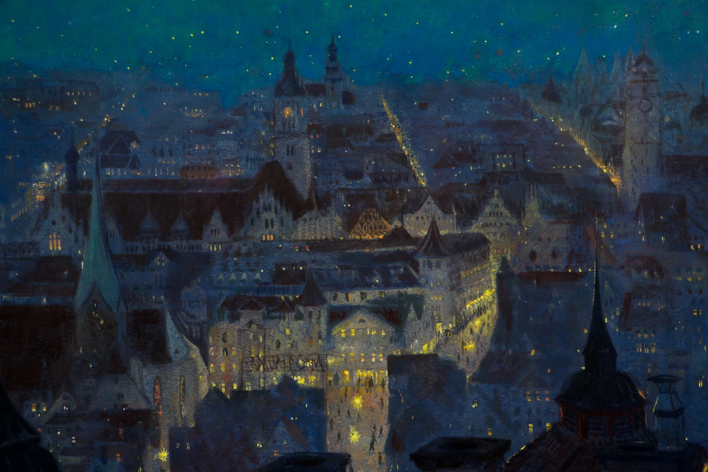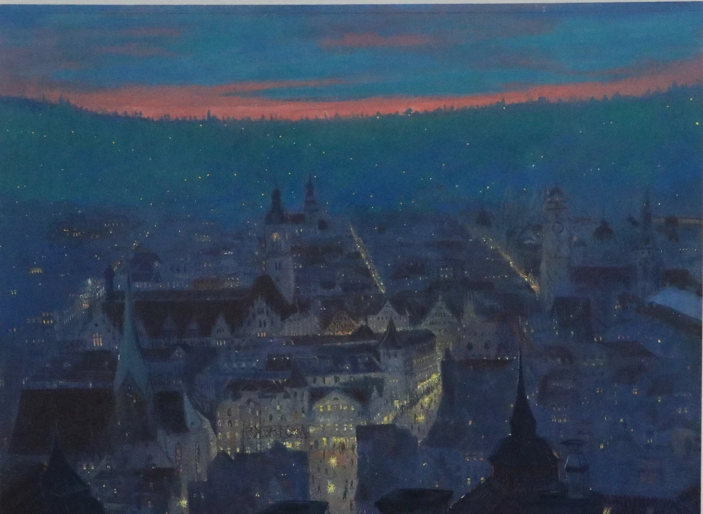 Blick auf das nächtliche Stuttgart von der Stitzenburgstraße (Bopser) aus gesehen von Reinhold Nägele aus dem Jahr 1914